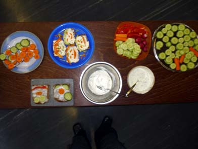 Für den Projekttag musste zuerst einmal genügend Essen vorbereitet werden. Die Erstklässler bereiteten angemachten Quark zu, zu dem es dann Pellkartoffeln gab. . Zusammen mit Frau Ixmeier kümmerten sich die Zweit- und Drittklässler vor allem um Rohkostplatten. Die Kinder der 4a kochten eine deftige Kartoffelsuppe, die noch mit Wienerchen vervollständigt werden konnte. |
