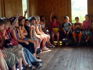 Nach jeder Einheit gab es noch eine Nachbesprechung im Häuschen, wobei die häufigsten Fehler noch einmal aufgegriffen wurden. So bewältigte auch ein Großteil unserer die Fahrradprüfung, 12 Kinder erhielten sogar einen Ehrenwimpel für besondere Leistungen in Praxis und Theorie. |