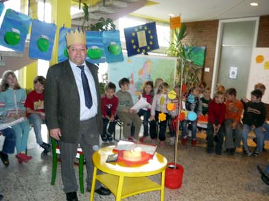 Als Dankeschön brachte er uns etwas Leckeres für die Pause mit. Unter großem Jubel verkündete er ein weiteres Geschenk für alle Schüler: keine Hausaufgaben an seinem Geburtstag! |