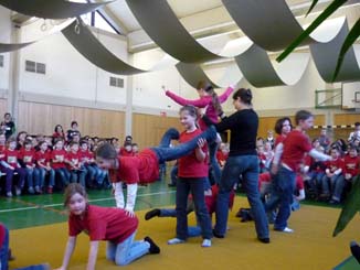 | Doch nicht nur Tanz stand auf dem Programm, auch akrobatische Kunststücke führten die Kinder dieser Gruppe gekonnt vor. Dafür erhielten sie auch viel Beifall aus dem Publikum. Frau Zink musst nur ganz selten helfend eingreifen und die Kinder ihrer Gruppe unterstützen. |