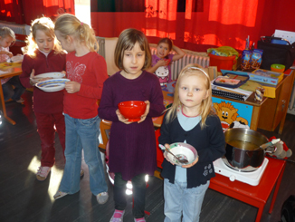 Bevor die Arbeit an den Stationen begann, durften sich die Kinder erst einmal kräftig stärken. Natürlich gab es eine köstliche Buchstabensuppe! |
