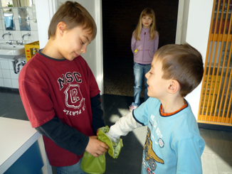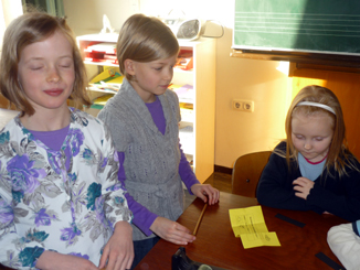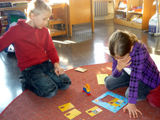 Bei diesem Hexenspiel ging es um das richtige Zusammensetzen von Wörtern. Mit der Hexe konnte jedes Kind seine Arbeit selbst kontrollieren. Dann überprüfte Sebastian, ob die Erstklässler das Wort richtig vorlesen konnten. |
