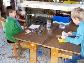 | Hier durften alle Kinder einen Text auf Kassette sprechen. Leon aus der 3. Klasse sorgte dabei für die Technik. |
