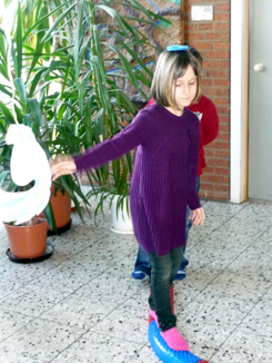 Balancieren mit einem Buchstaben auf dem Kopf ist keine einfache Sache! Als Belohnung gab es am Ende dieser Station einen Buchstabenknabberkeks. |