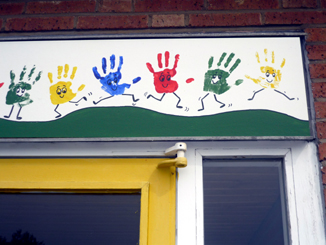 | Auch die Nebeneingänge bekamen neue Türschilder. Dazu verwandelten die Kinder der 4. Klasse und Frau Zink ihre Handabdrucke in lustige Männchen. Schlicht aber wirkungsvoll! |