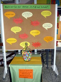 Die Aktion "Zu Fuß zur Schule" soll für Kinder einen Anreiz bieten, möglichst oft den Weg zur Schule ohne Auto zurückzulegen. Gemeinsam mit den Kindern wurden die Vorteile erarbeitet, wie z.B. Selbstständigkeit, Bewegung, Entlastung der Umwelt, zunehmende Sicherheit im Straßenverkehr... . Diese Argumente wurden anschaulich an einer Tafel im Eingangsbereich festgehalten. |