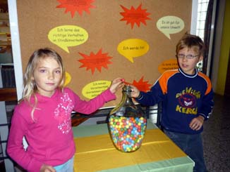 | Für jede gelaufene, mit dem Fahrrad oder Roller zurückgelegte Wegstrecke erhält jedes Kind täglich eine Kugel. Die Kugeln werden dann in einem großen Glasbehälter gesammelt. Ist der Behälter voll, winkt allen Schülern eine "Belohnung". |