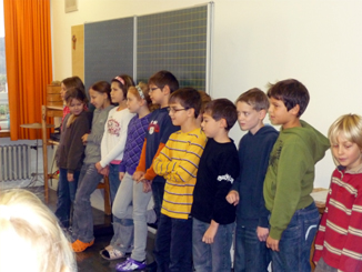 Bevor es ans Spielen ging, trafen sich alle Schüler, Lehrer und Eltern zu einem gemeinsamen Beginn. Die Viertklässler begrüßten uns mit einem Lied über das Spielen. |