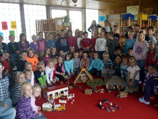 | Alle Kinder der Schule trafen sich, um die Spielmaterialien in Augenschein zu nehmen. Am liebsten hätten natürlich alle gleich mit dem Spielen begonnen. Der Startschuss für die Einbindung der Spielmaterialien in den Unterrichtsalltag fällt am Buß- und Bettag. Die Schüler sind dann eingeladen einen Spielvormittag in der Schule zu verbringen. Zahlreiche Eltern unterstützen uns dann bei unserer ersten Aktion zu "Spielen macht Schule". |