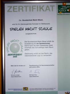Im Frühjahr nahm die Grundschule Markt Bibart an einer Ausschreibung zum Thema "Spielen macht Schule" teil. Es galt, ein Konzept bezüglich des sinnvollen Einsatzes von Spielmaterial im Unterrichtsalltag zu entwickeln. 50 Schulen in Bayern winkte als Preis eine "Spielezimmerausstattung" nach Wahl. Unser Konzept wurde als originell und stimmig eingestuft. Am ersten Schultag nach den Sommerferien erhielten wir die Nachricht, dass wir zu den "Gewinnerschulen " in Bayern gehören. |