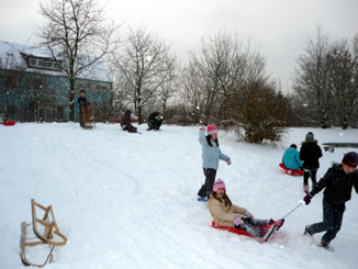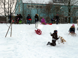 Viele Kinder brachten von daheim ihren Schlitten mit. Wenn man mit Freunden unterwegs ist, macht es auch nichts aus, dass der Schlittenberg nur sehr kurz ist. |