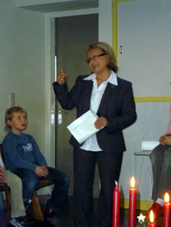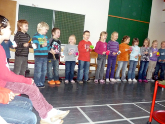 | Die Kinder der 1. Klasse hießen die Zahnärztin mit einem Lied herzlich willkommen. Das Lied handelte von einer Hexe, die nur noch einen Zahn im Mund hat. Als Begleitinstrumente dienten Zahnputzbecher und Zahnbürsten. |