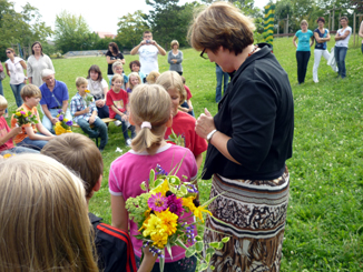 | Danach verabschiedete sich Frau Reichelt von "ihren" Viertklässlern. Jeder, der die Schule verließ, bekam von einem Erstklässler einen Blumenstrauß überreicht. |