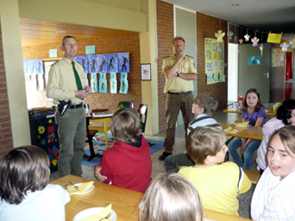 Danach durften die Polizisten aber noch nicht die Schule verlassen, sondern "mussten" mit den Viertklässlern und Frau Reichelt erst noch Kaffee trinken und die leckeren Kuchen verspeisen. Aber das war für die beiden keine schwierige Aufgabe! |