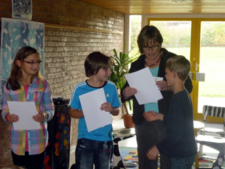 | Die drei Schulhaussieger Judith, Jakob und Hannes erhielten von Frau Reichelt für ihre hervorragenden Leistungen eine Urkunde sowie ein kleines Geschenk. Wir alle drücken den zwei Jungs, die Markt Bibart in der nächsten Runde vertreten dürfen, die Daumen. |