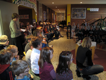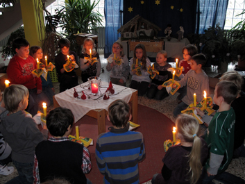 Am letzten Tag vor den Weihnachtsferien traf sich die Schulfamilie zu einer kleinen Weihnachtsfeier. Musikstücke, Lieder, Gedichte und ein Krippenspiel hatten die Klassen vorbereitet. Die feierlichen Vorführungen und die weihnachtliche Atmosphäre stimmten sehr gut auf die bevorstehenden Festtage ein. |