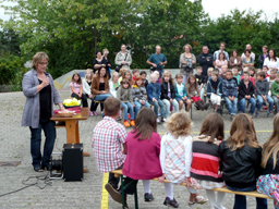 Frau Reichelt begrüßte die neuen Erstklässler, ihre Eltern, das Kollegium und natürlich die "großen" Schüler im Pausehof und wünschte allen ein erfolgreiches Schuljahr 2011/12. |