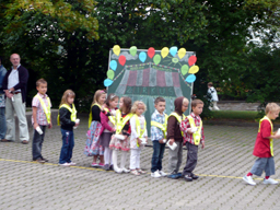 | Nachdem auch der Bürgermeister seine guten Wünsche übermittelt und Herr Pecher von der Sparkasse die Sicherheitstrapeze überreicht hatte, machten sich die Erstklässler auf zum Einzug ins Schulhaus. |