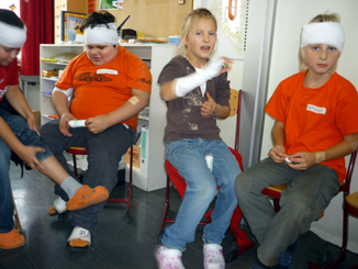 In der Woche der Gesundheit und Nachhaltigkeit besuchte Frau Khavvam vom BRK Neustadt/Aisch die 3. und 4. Klassen und frischte das Wissen über Erste-Hilfe wieder auf. Das Absetze eines Notrufes, das richtige Anbringen eines Pflasters, das Anlegen von Verbänden sowie die stabile Seitenlage wurden geübt. Außerdem wurde das richtige Verhalten bei Verbrennungen besprochen. |