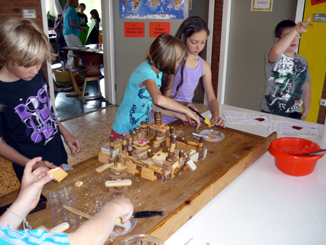 | Nach den Vorführungen wurden für die Schüler und ihre Geschwister viele unterschiedliche Stationen rund ums Thema Mittelalter angeboten. Alle gemeinsam bauten an einer großen Waffelburg, die dann nach dem Schulfest "gestürmt" werden darf. |