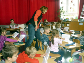 | Frau Henninger meistert diese Aufgabe mit Bravour! Noch sind die Kinder mit Begeisterung bei der Sache. Wir freuen uns schon auf ihren ersten Auftritt. |