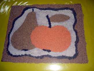 | Die Drittklasskinder legten gemeinsam mit Frau Zink dieses wunderschöne Herbstbild aus Reis und Hülsenfrüchten. |