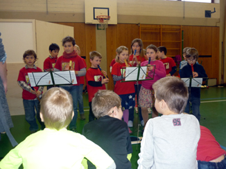 Frau Henninger und ihre Flötengruppe (27 Schüler, hauptsächlich Erstklässer!!!) spielten uns drei Lieder vor. |