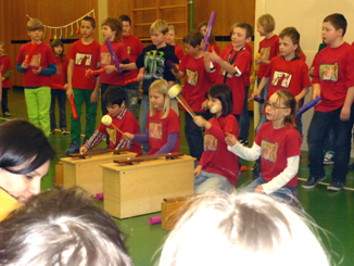 | Mit Boomwhackers und Klangstäben begleiteten die Kinder der 3. und 4. Klasse gekonnt zwei Musikstücke. |