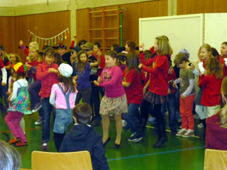 | Den Schlusspunkt bildete der Gangnam - Style, den die Kinder der Musik- und Bewegungsgruppe tanzten und zu dem sie dann alle anderen einluden. Nur noch wenige hielt es da auf ihren Stühlen!! |