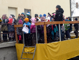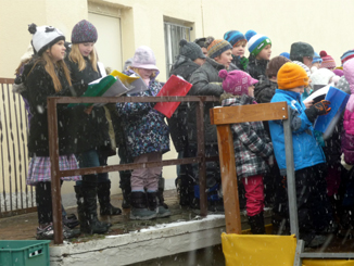 | Trotz der widrigen Wetterverhältnisse sangen die Kinder unbeschwert auf. |