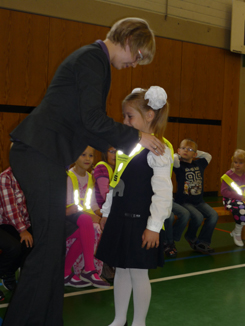 | Frau Göß von der Sparkasse hängte den Kindern das Sicherheitstrapez um, damit sie am Schulweg für alle weithin sichtbar sind. |