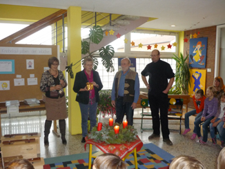 Frau Teufel, Herr Marhofer und Herr Stubenrauch überreichten Frau Reichelt das "verfrühte" Weihnachtsgeschenk. Kinder und Lehrer bedankten sich mit einer kleinen musikalischen Darbietung herzlich bei den Spendern. |