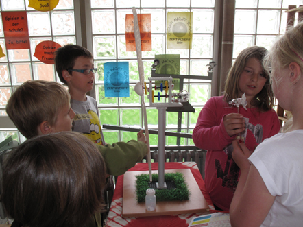 Anhand eines Modells erfahren die Kinder, wie die Verbrennung von Kohle und Öl unser Klima schädigen. |