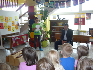 Nachdem sich die Schulgemeinschaft von Ludwig Günther verabschiedet hatte, war es klar, dass auch der neue Bürgermeister, Klaus Nölp, von den Kindern und Lehrer gebührend empfangen werden musste. Nach einer kurzen Schonfrist zum Einarbeiten kam der Bürgermeister Anfang Juni zu seinem Antrittsbesuch in die Schule. Nach einer musikalischen Begrüßung erfuhr er von den Erstklässern erst einmal ganz genau, was eigentlich die Aufgabe eines Bürgermeisters sei. So muss er unter anderem viel reden und viel Bier trinken können und immer nach Fundstücken Ausschau halten. Nach dieser „Belehrung“ musste Bürgermeister Nölp, der ja nur von den erwachsenen Markt Bibarter Bürgern gewählt wurde, auch den Schülern beweisen, dass er sie würdig vertreten kann. So galt es in sechs Unterrichtsstunden geographische, mathematische, künstlerische, sprachliche und auch musikalische Fähigkeiten unter Beweis zu stellen. Die strengen „Lehrkräfte“ waren am Ende mit seinen Leistungen sehr zufriedenen und überreichten ihm eine Urkunde. Auch füllten die Kinder viele gute Wünsche und die unterschiedlichsten Dinge, die ein Bürgermeister aber unbedingt braucht, in seine Schultüte. So erhielt er auch einen großes Bündel „Geldscheine“, damit die Schulsanierung reibungslos über die Bühne gehen kann. Dass er über genügend Humor verfügt, hat Bürgermeister Nölp bei seinem ersten Besuch eindeutig bewiesen.