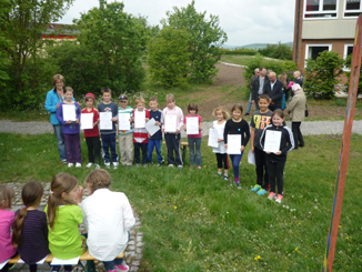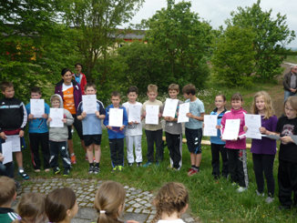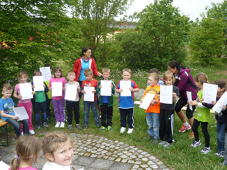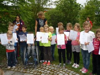 Zum Abschluss des besonderen Schulvormittags bekamen alle Schüler, nachdem sie den restlichen Kuchen fast ganz verputzt hatten, von ihren Lehrkräften Urkunden überreicht. Und wieder geizten die Zuschauer nicht mit großem Applaus.